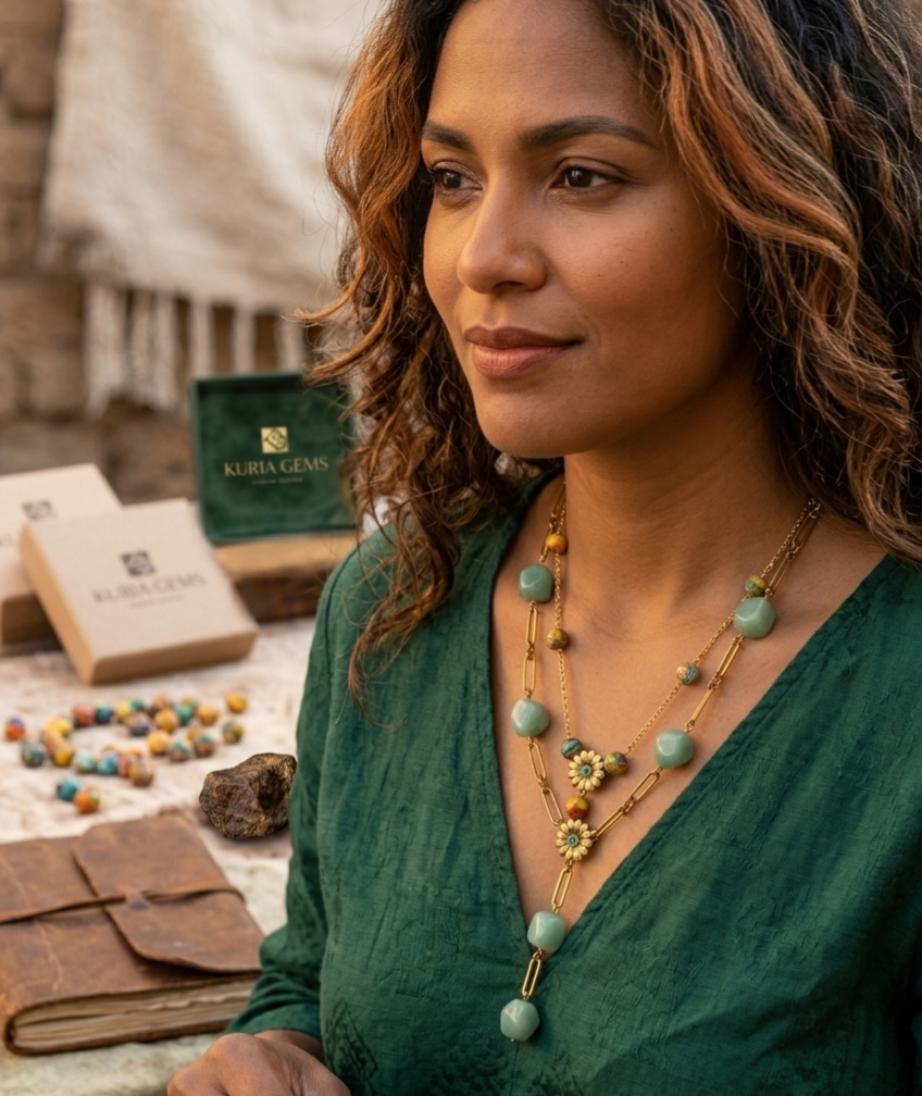 Embrace the energy of the Bahari Mosaic (Swahili for Ocean), a necklace handmade for the woman who carries her heritage with pride. This piece blends raw natural power with refined contemporary elegance.